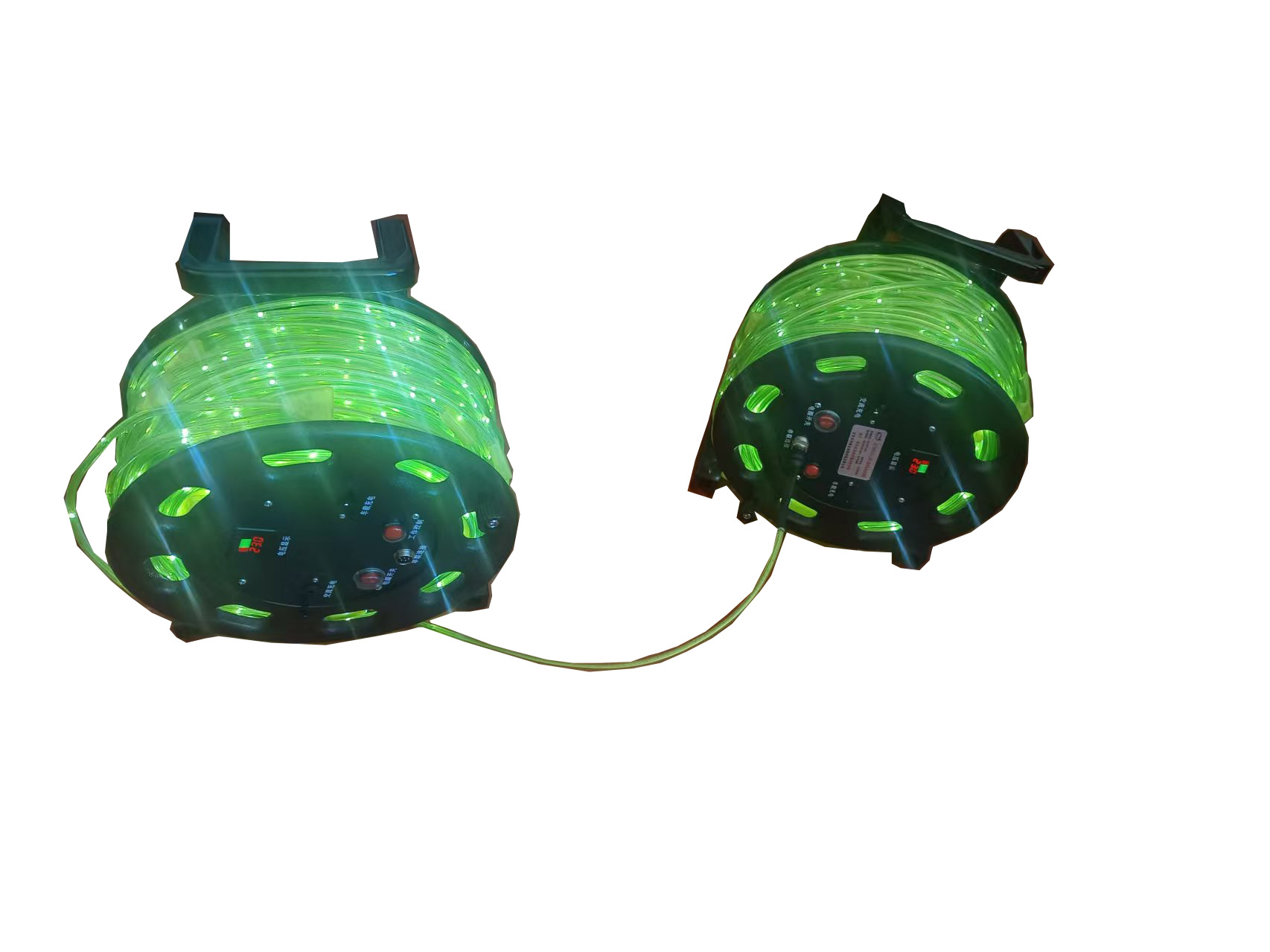 1、线盘及供电系统采用一体结构设计:该照明线采用一体式防爆结构设计,线体材质柔软,具有防水、耐拉、抗折、可反复360°弯曲,随意打结、剪接,其折角小于5°,不会影响发光性能。转盘转动灵活、无卡阻现象,表面无明显制造缺陷